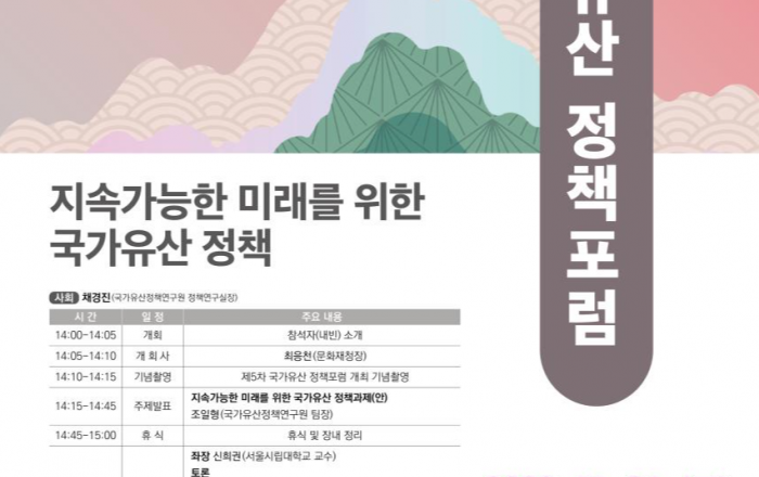 문화재청은 11월 24일(금) 오후 2시 국립고궁박물관(서울 종로구)에서 「제5차 국가유산 정책토론회(포럼, 이하 ‘토론회’)」를 개최한다. 문화재청은 「국가유산기본법」의 공포(‘23.5.16.)를 계기로, 국가유산 체제의 새로운 정책방향을 수