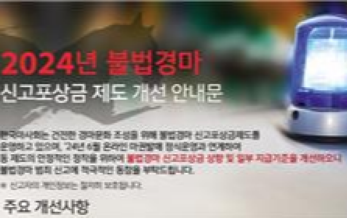 한국마사회가 온라인 마권발매 정식 운영에 대비해 불법경마 신고 활성화에 나선다. 한국마사회는 인센티브 상향 등 신고포상금 제도를 강화하고 추가 인센티브가 지급되는 '집중 신고기간'을 8월 말까지 운영한다고 밝혔다. '24년 6월 1일 신고 건부터 적용되는 불법경마
