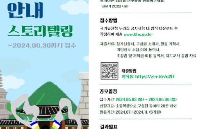 국가유산청은 국가유산 체계 전환에 발맞춰 오는 6월 30일(일)까지 우리 국가유산의 역사적 가치와 우수성을 담은 콘텐츠를 제작하는 「2024 어린이가 만드는 국가유산 안내 스토리텔링 공모전」에 참여할 어린이(초등학생 동아리)를 모집한다. 국가유
