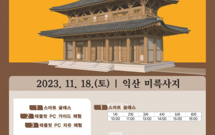 문화재청 국립문화재연구원은 11월 18일(토) 오전 10시부터 오후 5시까지 익산 미륵사지(전북 익산시)에서 일반 시민을 대상으로 증강현실(AR)로 복원된 미륵사 중문(中門)을 ‘스마트글래스’를 통해 만나볼 수 있는 「익산 미륵사 중문 콘텐츠 시연회」를 진행한다.