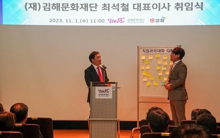 (재)김해문화재단은 최석철(60) 대표이사가 2023년 11월 1일 자로 신규 취임했다고 밝혔다. 이번 채용은 공개모집 공고를 시작으로 서류 및 면접 심사, 김해시의회 인사청문회 검증 절차를 거쳤다. 신임 대표이사는 향후 2년간 김해문화재단을 이끌게 된다. 최석