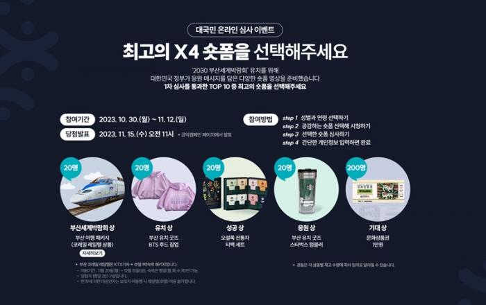 “2030 부산 세계박람회 유치 응원 영상, 직접 심사해주세요” 문화체육관광부는 지난달 30일부터 12일까지 41개 중앙부처가 참여한 가운데 ‘2030 부산 세계박람회’ 유치 응원 ‘짧은 영상(쇼트폼) 국민 투표 이벤트(쇼케이스)’를 열고 국민과 함께 응원 열기를