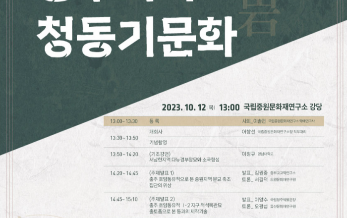 문화재청 국립문화재연구원 국립중원문화재연구소는 오는 12일 오후 1시 30분 국립중원문화재연구소(충청북도 충주시) 강당에서「호암동유적으로 본 충주지역 청동기문화」를 주제로 학술대회를 개최한다. 충주 호암동유적은 구석기시대부터 조선시대까지의 다양