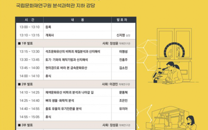 문화재청 국립문화재연구원은 10월 11일 국립문화재연구원(대전시 유성구) 분석과학관 강당에서 보존과학을 전공하는 대학생과 대학원생을 대상으로 최신 분석기술과 현장 적용 사례를 소개하는 문화유산 분석 설명회 「알아두면 쓸데 있는 문화유산 분석 이야기」를 개최한다.