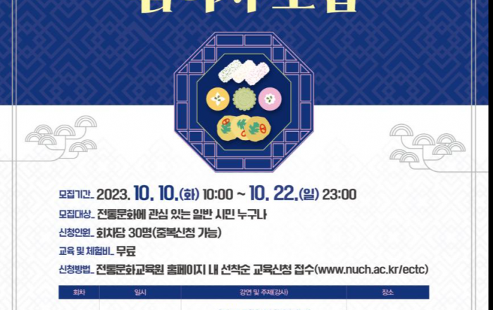문화재청 한국전통문화대학교 전통문화교육원은 오는 10월 25일(수)부터 11월 4일(토)까지 총 4회에 걸쳐 2023년 「국가유산 아카데미교육 – 한국의 전통음식」 교육을 운영한다. 「국가유산 아카데미교육」은 우리 국가유산 및 전통문화와 관련한