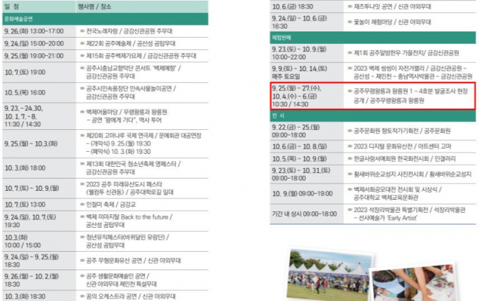 문화재청 국립문화재연구원 국립부여문화재연구소는 9월 25일(월) ~ 27일(수), 10월 4일(수) ~ 6일(금)까지 총 6일간 공주 무령왕릉과 왕릉원 1~4호분 재발굴조사 현장을 「2023 대백제전」과 연계하여 공개한다. * 현장공개(6일간): 9.25