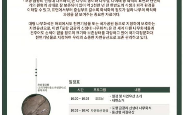 문화재청은 9월 15일 오전 10시 30분 대전 천연기념물센터(대전 서구)에서 「포항 금광리 신생대 나무화석」의 자연유산 지정 기념행사를 개최한다. 「포항 금광리 신생대 나무화석」은 높이 10.2m, 폭이 0.9~1.3m의 규모로 우리나라에서
