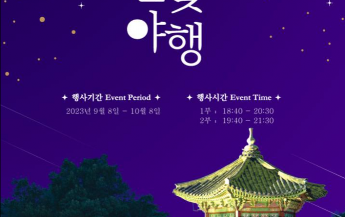 문화재청 궁능유적본부는 한국문화재재단과 함께「2023년 경복궁 별빛야행」하반기 행사를 오는 9월 8일부터 10월 8일까지 1일 2회씩 개최하며, 오는 23일(수) 오후 2시부터 예매권 추첨 응모를 시작한다. * 운영시간(회차당 32명) : ① 18:40∼