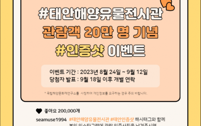 문화재청 국립해양문화재연구소는 태안해양유물전시관(충남 태안군 소재)의 누적 관람객 20만 명 돌파를 기념하여 사회관계망서비스(인스타그램) 행사를 개최한다. 8월 24일부터 9월 12일까지 20일간 전시관에서 촬영한 사진을 자신의 계정에 게시하면 20인을 추첨하여 해양문
