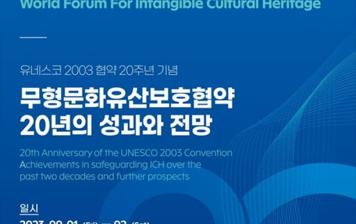 문화재청 국립무형유산원은 유네스코아태무형유산센터와 9월 1일(금)과 2일(토) 양일간 국립무형유산원(전북 전주시)에서 ‘무형문화유산보호협약 20년의 성과와 전망’을 주제로 <2023 세계무형문화유산포럼>을 개최한다. 올해로 7년째를