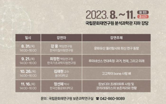 문화재청 국립문화재연구원은 8월부터 11월까지 매달 마지막 주 목요일 오후 2시에 국립문화재연구원 분석과학관(대전시 유성구)에서 문화유산 분석과 연구에 관한 다양한 주제로 각 분야의 전문가를 초청하여 이야기를 나누는『문화유산 분석·연구 콜로키움』을 개최한다.