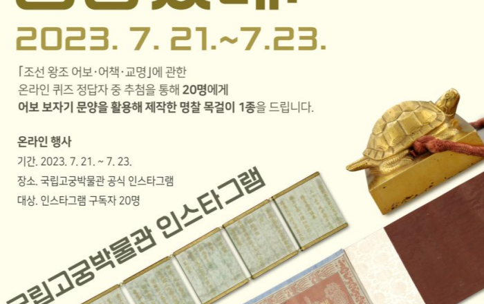 문화재청 국립고궁박물관은 지난달 보물로 지정된 「조선왕조 어보・어책・교명(朝鮮王朝 御寶・御冊・敎命)」을 소개하고, 그 가치를 알리고자 7월 21일부터 23일까지 국립고궁박물관 사회관계망서비스(인스타그램)에서 온라인 퀴즈 행사를 진행한다. * 국립고궁박물관