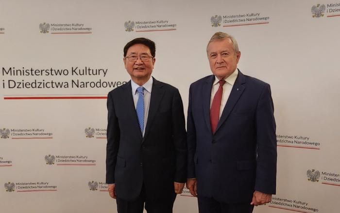 박보균 문화체육관광부 장관이 13일(현지시간) 폴란드 바르샤바 문화유산부 청사에서 표트르 글린스키 폴란드 문화유산부 장관과 양자회담을 갖고, 문화를 통한 교류 증진을 약속했다. 2010년 주폴란드문화원 개원 후 13년 만에 폴란드에서 성사된 이번 만남에서 양국 장