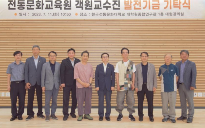 문화재청 한국전통문화대학교와 전통문화교육원 객원 교수진이 7월 11일 오전 11시 본교 온지관(대학원종합연구관)에서 문화재수리기능 자격을 갖춘 전문인력 양성 지원을 위한 발전기금 기탁식을 개최했다. 이번 발전기금 기탁식은 그간 문화재수리기능인을