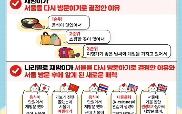 서울시와 서울관광재단은 서울을 2회 이상 방문(재방문)하거나 아직 방문 경험이 없는 미방문객을 대상으로 서울 방문 유형별 실태조사 결과를 발표했다. 서울 여행에 대한 외래관광객의 인식 및 서울 관광의 경쟁력 파악을 위해 '2023 서울시 외래관광객 실태조사'의 이슈