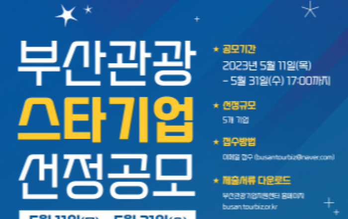 부산시와 부산관광공사(이하 공사), 부산관광기업지원센터(이하 센터)는 문화체육관광부·한국관광공사의 지원을 받아 부산 관광을 선도할 '2023 부산관광 스타기업' 선정 공모를 진행한다고 11일 밝혔다. '부산관광 스타기업' 육성사업은 부산지역의 유망 관광기업을 선정해