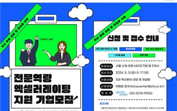 서울시와 서울관광재단은 미래 관광·MICE 선도 역량 강화를 위해 오는 5월 17일(금)까지 전문역량 엑셀러레이팅 지원 기업을 모집한다고 밝혔다. 전문역량 엑셀러레이팅은 서울 소재 관광·MICE기업 5개 사를 선정하여 5대 혁신 분야의 맞춤형 상담 및 컨설팅을 지원