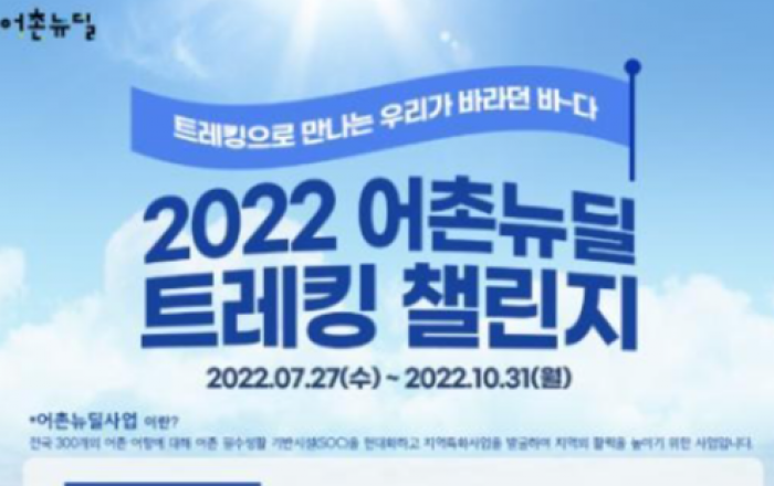 7월 27일(수)부터 10월 31일(월)까지 강원도 동해시 어달항, 경상북도 경주시 수렴항, 경상남도 거제시 학동항, 전라북도 군산시 장자도항, 인천시 소무의항 등 어촌뉴딜 300사업 완공지 및 준공 예정지 5개소에서 ‘2022년 어촌뉴딜 트레킹 챌린지’를 진행한다.이