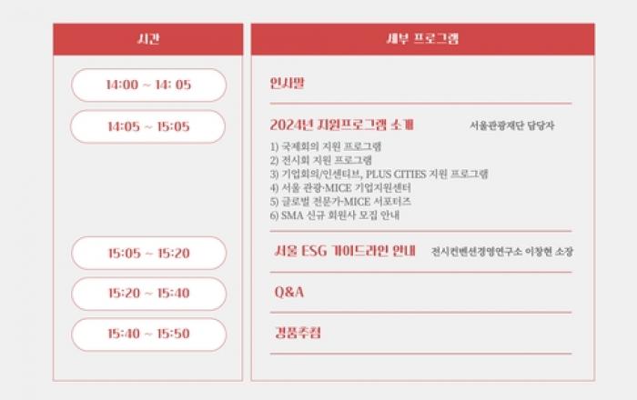 서울시와 서울관광재단은 오는 27일 '2024 서울 MICE 지원 설명회'를 온라인으로 개최한다고 밝혔다. 이번 설명회는 지난 14일 공고된 '서울특별시 마이스(MICE) 산업 지원계획'에 대한 자세한 내용을 들을 수 있는 자리로, 서울로 유치를 추진하거나 서울 개