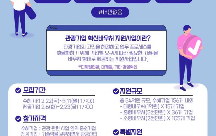 문화체육관광부는 한국관광공사와 함께 ‘2024년도 관광기업 혁신바우처 지원사업’ 참여 기업 150여 개사를 모집한다. 문체부와 관광공사는 지난 2020년부터 관광기업 혁신바우처 지원사업을 시작한 이후 지난해까지 관광기업 525개를 선발해 지원해왔다. 올해 공모전에