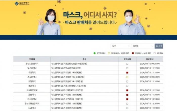 부산광역시는 공적 마스크 판매현황을 실시간으로 알려주는 '부산시 공적 마스크 재고 알림(http://www.busan.go.kr/maskinfo)' 서비스를 11일 오후 3시부터 오픈한다고 밝혔다.이 서비스는 시민들이 마스크 판매현황 정보를 알지 못해 여러 곳의 판매처