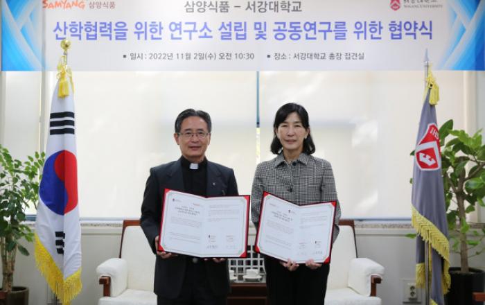 삼양식품은 서강대학교(이하 서강대)와 2일 산학협력을 위한 연구소 설립 및 공동연구를 위한 업무협약을 체결했다고 3일 밝혔다. 이날 협약식은 서강대 총장실에서 진행됐다. 김정수 삼양식품 부회장, 장재성 삼양식품 부사장, 전병우 삼양식품 전략운영본부본부장, 김홍