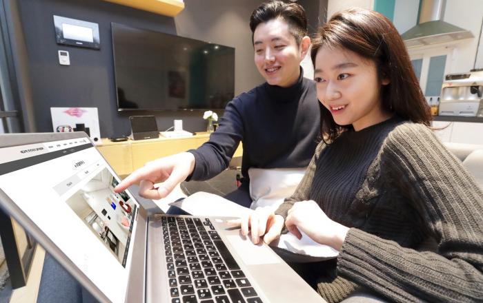 ▲ 노트북으로 사이버 모델하우스에 접속해 주택을 살펴보고 있다.KT가 대우건설과 함께 ‘코로나19(코로나바이러스감염증-19)’ 확산 방지를 위해 실물 견본주택을 폐관하고 클라우드 CDN 기반의 사이버 모델하우스를 오픈했다고 18일 밝혔다. 클라우드 CDN(Conten