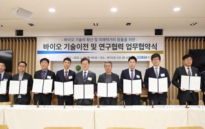 경기도와 경기도경제과학진흥원(이하 경제과학진흥원)이 도내 바이오기업 기술역량 강화와 미래 먹거리 창출을 위해 팔을 걷어붙였다.이재명 경기도지사와 김기준 경제과학진흥원장, 도내 바이오 기업(노톡스테라피·다은메디칼·알파바이오·에스아이바이오·온코빅스·코팜·티이엔·퓨젠바이오)