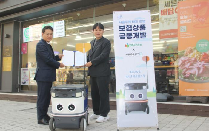 DB손해보험은 뉴빌리티와 ‘실내외 자율주행 로봇 서비스를 위한 보험상품’ 제공을 위한 업무 협약을 체결했다고 31일 밝혔다.실외 자율주행 로봇에 대해 종합보험을 적용하는 국내 첫 사례로, 뉴빌리티의 자율주행 로봇 뉴비는 신뢰성 높은 자율주행 성능을 확보해 보행자 도로