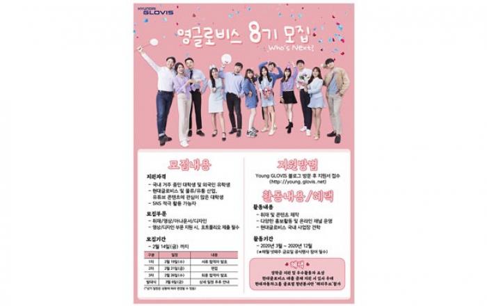 글로벌 SCM 전문기업 현대글로비스(http://www.glovis.net)가 대학생 기자단 ‘영글로비스(Young GLOVIS)’ 8기를 모집한다.영글로비스 8기는 현대글로비스와 물류·유통 산업에 관심이 있는 대학생이라면 누구나 지원 가능하다. 모집분야는 취재·영상·