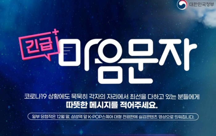 문화체육관광부는 코로나19로 어려움을 겪고 있는 국민들을 위로하고 감사의 마음을 전하기 위해 ‘긴급마음문자’ 캠페인을 진행한다고 21일 밝혔다.문체부는 이 캠페인을 통해 국민들이 코로나19 위기를 극복하는 데 앞장서 온 우리 이웃에게 남긴 감사와 응원의 문자를 3차원