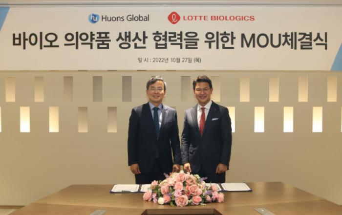 휴온스그룹이 롯데바이오로직스와 손잡고 글로벌 바이오의약품 시장 진출을 위한 본격적인 행보에 나선다.휴온스글로벌(대표 송수영)은 27일 성남 판교 휴온스그룹 사옥에서 롯데바이오로직스(대표 이원직)와 바이오 의약품 임상 및 상업 생산을 위한 업무협약(MOU)을 체결했다고