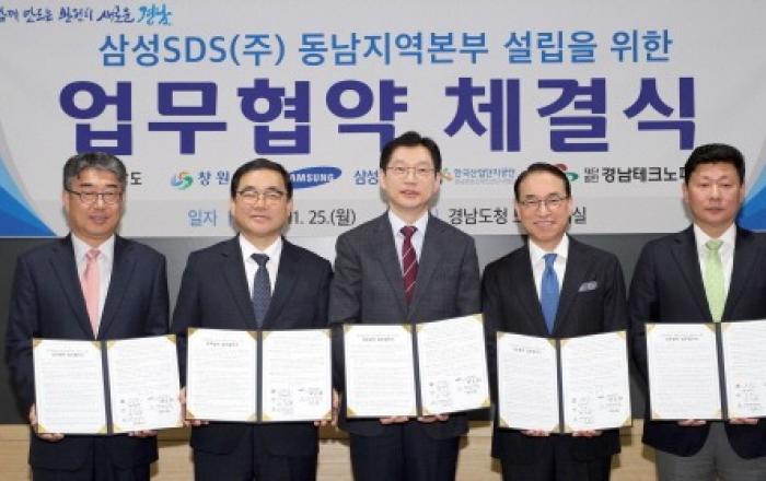 경남 창원시는 ICT 선도 대기업인 삼성SDS㈜와 손을 잡고 스마트 산단 조성에 날개를 달았다.시는 25일 오전 10시 창원 스마트 산단에 '삼성SDS 동남지역본부' 설립을 위한 투자유치 업무협약(MOU)을 체결하고 스마트공장 보급 활성화를 위한 상호 협력체계를 구축했