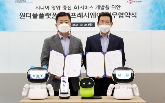 CJ프레시웨이가 10월 24일 서울시 마포구 CJ프레시웨이 상암본사에서 인공지능 헬스케어 기업 원더풀플랫폼과 ‘시니어 영양 증진 AI 서비스 개발’을 위한 업무 협약을 체결했다.이번 업무 협약은 초고령화 사회 진입에 따라 인공지능(AI) 돌봄 로봇을 운영하는 원더풀플랫