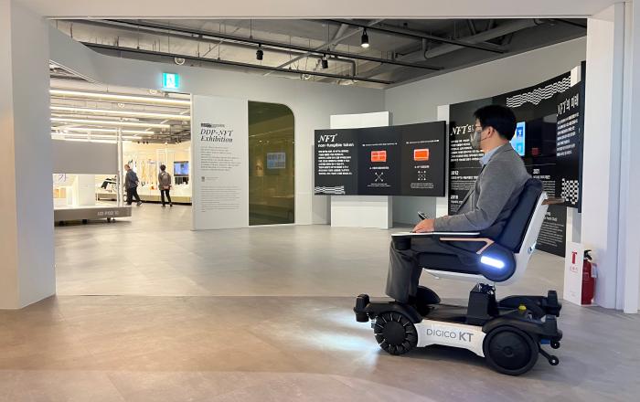 KT가 서울디자인재단과 함께 서울 중구 동대문디자인플라자(이하 DDP) 디자인쇼룸과 디자인홀에서 전시 관람들을 대상으로 ‘자율주행 스마트로봇체어’를 3주간 시범 운영한다고 25일 밝혔다. 10월 24일부터 11월 11일까지 DDP를 방문한 관