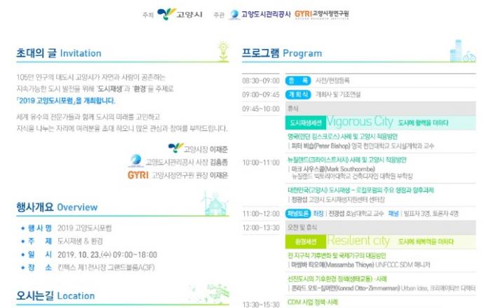 고양시는 국내외 도시재생 및 환경 전문가들이 한자리에 모이는 ‘2019 고양도시포럼’을 10월 22일부터 23일까지 고양시 일원 및 킨텍스에서 개최 한다.“도시, 미래를 묻다”라는 슬로건으로 올해 처음 열리는 ‘2019 고양도시포럼’은 고양형 도시재생 방향을 고민하고,