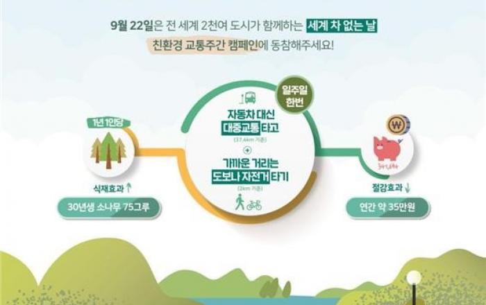 ‘세계 차 없는 날(9.22)’을 맞아 9월22일까지 친환경 교통주간을 운영한다.대구시는 대구지속가능발전협의회와 ‘함께 걸어요’라는 주제로 친환경교통주간 동안 자전거 대행진, 자전거 출·퇴근 챌린지, 대구생태교통포럼 등 다양한 프로그램을 진행해 시민들에게 저탄소생활에