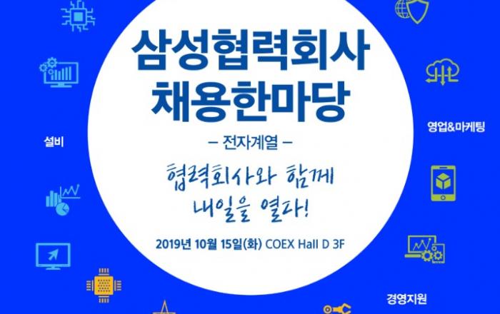 삼성전자가 다음달 15일 서울 코엑스에서 삼성디스플레이·삼성SDI·삼성전기·삼성SDS와 함께 100여개의 전자계열 협력회사가 참여하는 '2019 삼성 협력회사 채용 한마당'을 개최한다.'삼성 협력회사 채용 한마당'은 구직자에게 양질의 일자리를 제공하고, 협력회사에게는