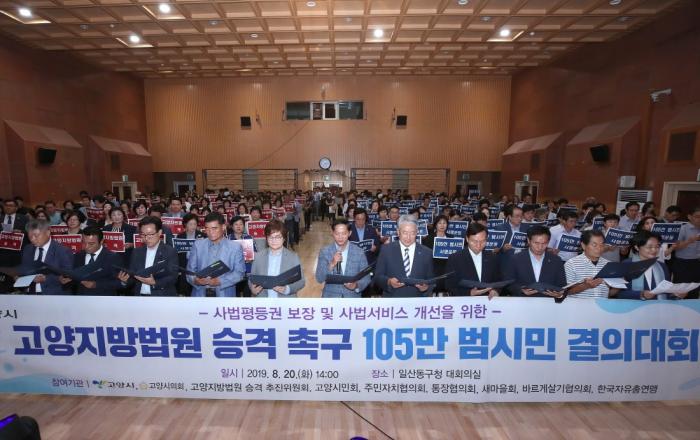 고양시는 ‘고양지방법원 승격 105만 범시민 결의대회’를 8월 20일 일산동구청에서 지역정치인, 시민단체 대표, 학계, 법조계 등 350여 명이 참석한 가운데 개최했다. 이번 결의대회는 고양지원의 지방법원 승격을 위한 고양시의 본격적인 행보로 시민들의 관심과 참여를 유