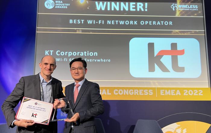KT는 19일(현지시각) 네덜란드, 암스테르담에서 개최된 ‘WBA(Wireless Broadband Alliance) 어워드’에서 ‘최고 와이파이 네트워크 사업자상’을 수상했다고 20일 밝혔다. KT는 같은 날 개최된 ‘Network X 글로벌 어워드’에서 ‘디지털 혁