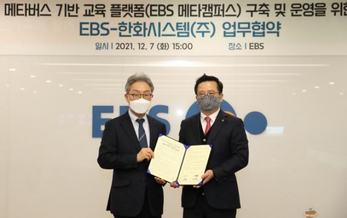 한화시스템 ICT 부문이 한국교육방송공사(EBS)와 함께 메타버스 기반의 공공교육 서비스 개발에 나선다고 8일 밝혔다.한화시스템은 EBS와 7일 경기도 고양시 일산 EBS 본사에서 메타버스 기반 교육 플랫폼 ‘EBS 메타캠퍼스’ 구축 및 운영을 위한 업무협약(MOU)을