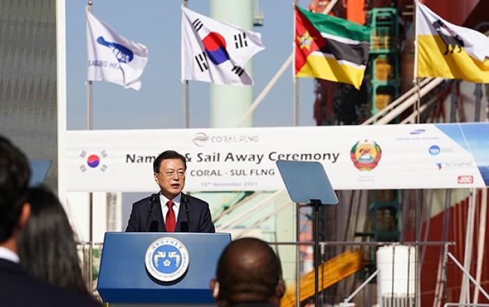 문재인 대통령은 15일 국내 조선소에서 건조돼 출항을 앞둔 ‘FLNG’(부유식 해양 LNG 액화플랜트)에 대해 “‘코랄 술(Coral-Sul)’ FLNG가 대량 생산하게 될 LNG는 세계가 탄소중립으로 가는 여정에 큰 힘이 될 것”이라고 말했다.문 대통령은 이날 경남