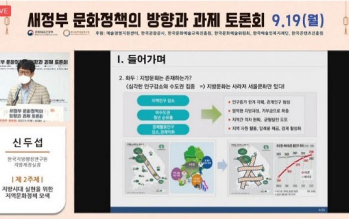 문화체육관광부는 한국문화관광연구원과 함께 지난 19~20일 콘텐츠코리아랩(CKL)에서 ‘윤석열 정부 문화정책의 방향과 과제’를 주제로 토론회를 열고 예술창작 환경, 지역문화정책, 공정한 문화 누림, 문화콘텐츠 확산, 새 정부 관광정책 등에 대한 현장과 전문가 의견을 수