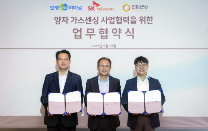 SK텔레콤과 보령 LNG 터미널 및 퀀텀센싱 3사는 충청남도 보령에 있는 LNG 저장탱크에 양자가스센싱 시스템을 설치·적용하기로 하는 MOU를 체결했다고 20일 밝혔다.‘양자센싱’은 미세한 크기의 양자를 검출해 이를 전기신호로 바꾸는 기술로, 가스센싱·자율주