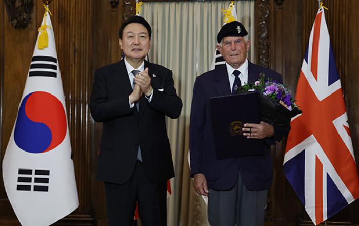 영국을 방문 중인 윤석열 대통령은 19일(현지시간) 런던에서 빅터 스위프트 한국전 참전용사협회 회장에게 국민포장을 수여하고 자유 수호를 위한 헌신에 감사의 뜻을 전했다. 윤 대통령은 이날 런던 웨스트민스터사원에서 열린 엘리자베스 2세 여왕의 국장 미사에 참석하고