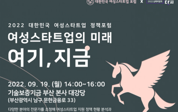 사단법인 여성스타트업 포럼(이하 여성스타트업 포럼)은 여성 창업 생태계의 발전과 전국 단위 활성화 방안 마련을 위해 9월 19일 부산 기술보증기금 본사에서 ‘여성스타트업의 미래-여기, 지금’이라는 주제로 정책 포럼을 개최한다고 밝혔다. 이번 포럼은 행정안전부가