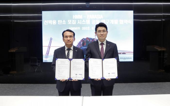 HMM이 파나시아와 선박용 탄소 포집 시스템 공동 연구에 대한 업무협약(MOU)을 체결했다고 15일 밝혔다.선박용 탄소 포집 시스템은 선박 운항 시 발생하는 배기가스 내 이산화탄소(CO₂)를 포집해 배출을 방지하는 온실가스 대응 기술이다.14일 여의도 사옥에서 진행된