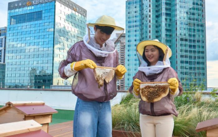 KB금융그룹은 KB국민은행 본점 옥상에 조성된 ‘K-Bee 도시양봉장’에서 올해 첫 번째 꿀 수확 행사를 가졌다.KB금융 직원들이 참여한 가운데 진행된 이날 행사에는 KB금융그룹이 후원하는 수영 국가대표 간판스타 황선우 선수와 KLPGA 프로골퍼 ‘슈퍼루키’ 이예원 선