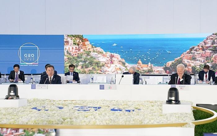 주요 20개국(G20) 정상회의 참석차 이탈리아 로마를 방문 중인 문재인 대통령은 31일(현지시간) “기후위기 대응에 있어서 G20이 더 많이 헌신하고 개도국의 처지를 고려한 지원을 해야 한다”고 말했다.문 대통령은 이날 로마 누볼라 컨벤션 센터에서 열린 G20 정상회