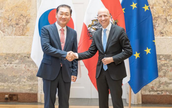 삼성전자 DX 부문장 한종희 부회장이 오스트리아를 방문해 현지 사업 현황을 점검하고, 8일(현지 시각) 오스트리아 비엔나에서 마틴 코허(Martin Kocher) 노동부 장관을 만나 경제협력과 지속 가능한 미래에 대해 논의했다고 13일 밝혔다.올해는 한국-오스트리아 수
